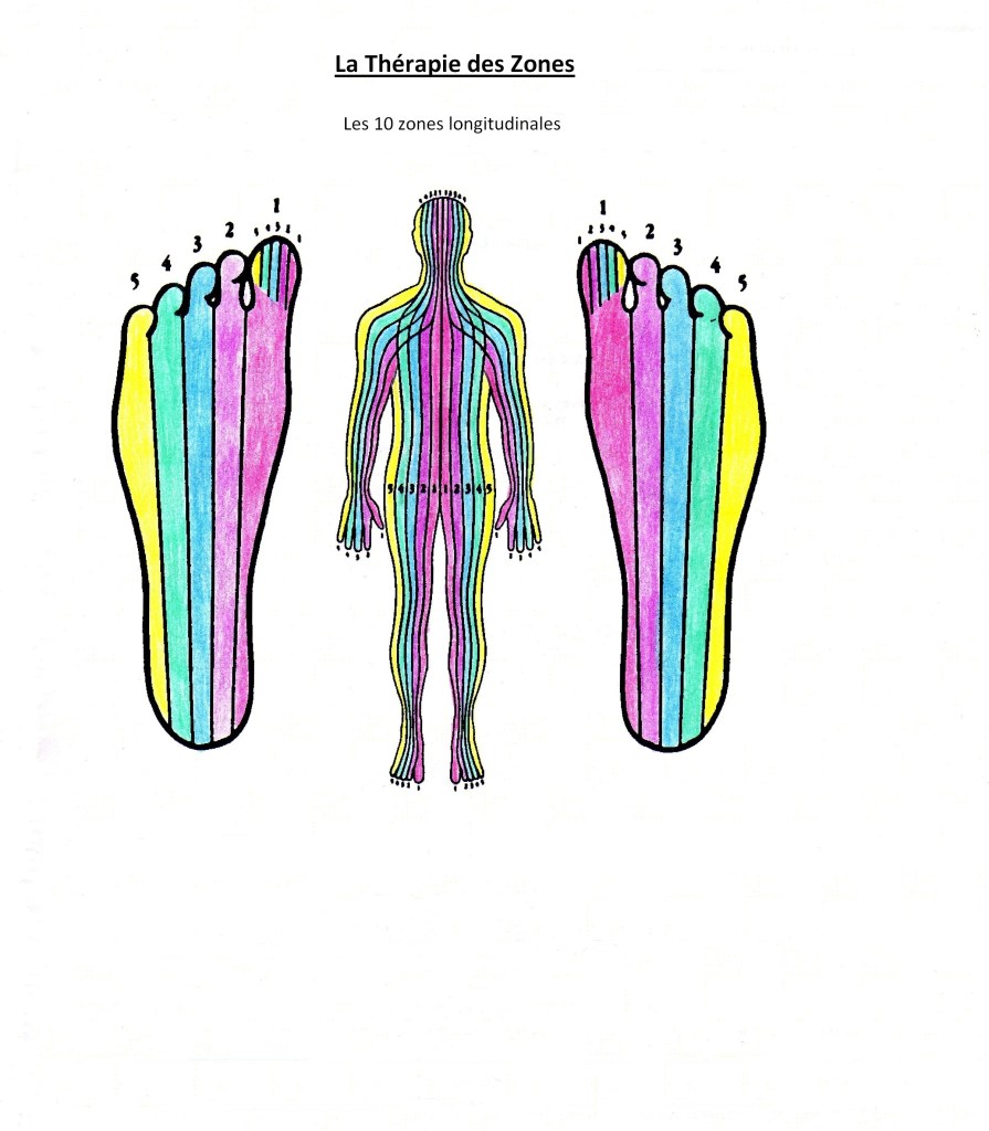 L’apport le plus important de tous ces travaux est la « thérapie des zones », c’est l’idée que le corps est divisé en 10 lignes longitudinales imaginaires (5 du côté droit, 5 du côté gauche).